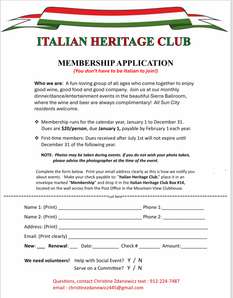 If you are interested in joining the Italian Heritage Club, please click the Membership button below. You will be directed to a PDF application that can be completed and submitted to become a member.