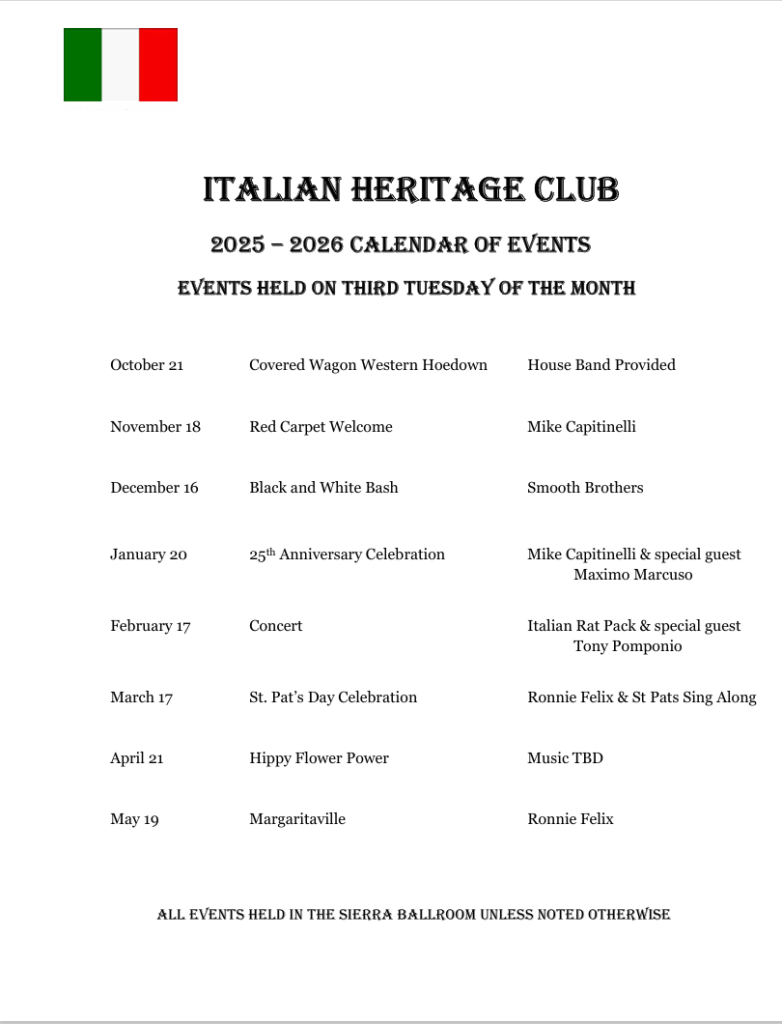 The Italian Heritage Club is dedicated to celebrating and preserving Italian culture, traditions, and community. Through social events, cultural activities, and shared experiences, our club brings together members who appreciate Italian heritage and the spirit of togetherness.